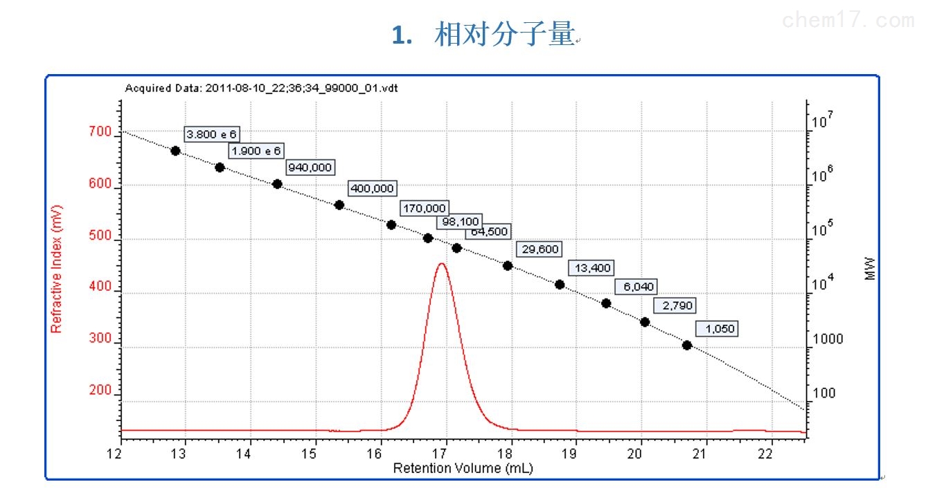 色譜原始譜圖,重複性進樣結果,分(fēn)子量Mn,Mw,Mz和分(fēn)子量分(fēn)布PD,分(fēn)子尺寸,Mark Houwink 曲線和參數