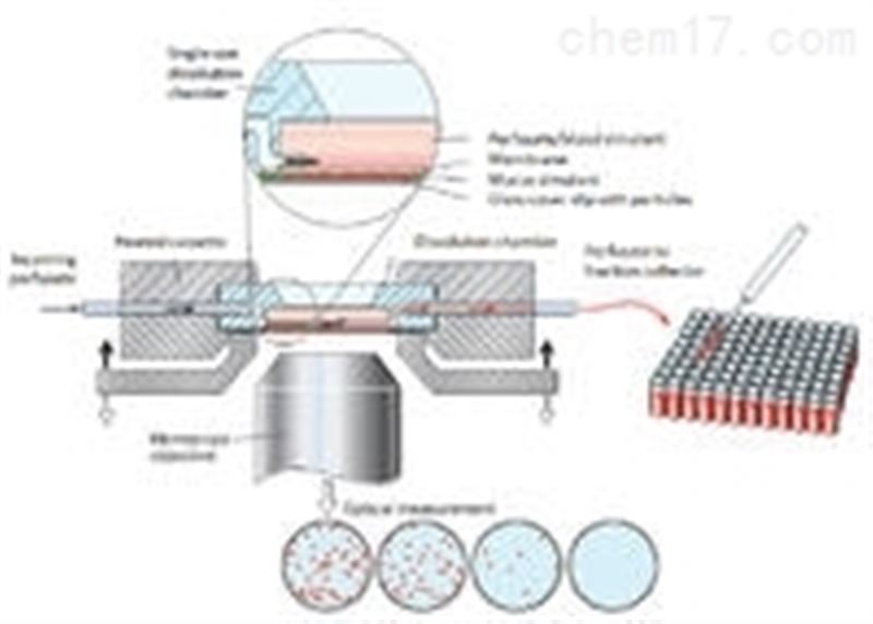在磚利的DissolvIt模塊中,PreciseInhale氣溶膠發生(shēng)器将微粉化幹粉,吸入制劑,納米氣溶膠顆粒等均勻地沉積在載玻片上,然後讓顆粒物和模拟粘液接觸進行溶出實驗。DissolvIt配置了倒置顯微鏡,可(kě)以通過載玻片窗(chuāng)口實時觀察記錄顆粒的溶解過程;另一方面模拟灌注液在血管中的流動,由精确控制的蠕動泵采用單向持續流動模式讓血液模拟液流經溶出池,餾分(fēn)收集器持續收集樣品,然後由LC-MS分(fēn)析。整套系統精确控溫在37℃。